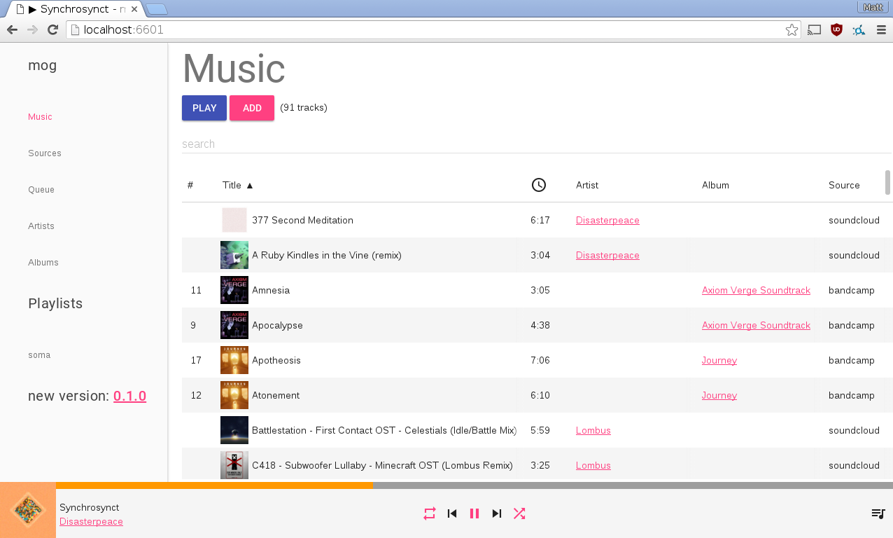 Each of the online music services had their own web interface. SomaFM has a web player, but can also be played with other devices. The Nintendo files required a different program on each machine. Overall I was using at least half a dozen different programs to play music on a regular basis, depending on what I was listening to and the computer I was using. What I wanted instead was a single program that could run on all of my computers, use the same interface, and play the music wherever it was. I wanted a single playlist that could have Bandcamp, Soundcloud, Google Music, and certain tracks from a Nintendo Sound File archive that lived on Google Drive or Dropbox, and could also play Shoutcast radio. More than this, I wanted to be able to use my keyboard's media keys, or whatever else I wanted, to control all of this music listening. No more clicking into the Google Music or Soundcloud tab just to hit pause or next.